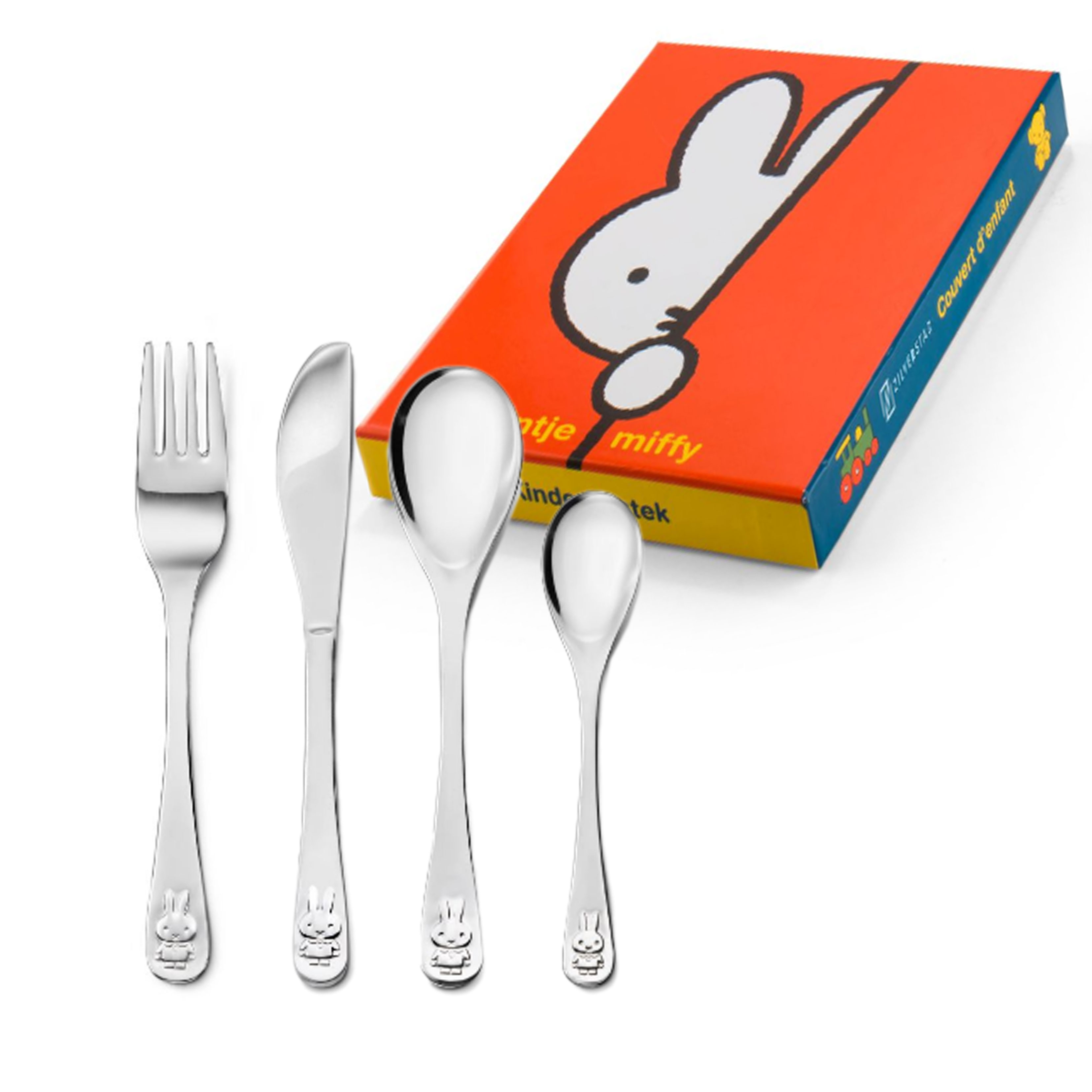 Populaire 4-delige bestekset van het wereldberoemde konijntje nijntje, getekend door Dick Bruna. Op ieder bestekonderdeel staat de afbeelding van nijntje. Omdat het bestek is vervaardigd uit 18/10 RVS kan het in de vaatwasser. De bestekonderdelen kunnen worden gegraveerd.