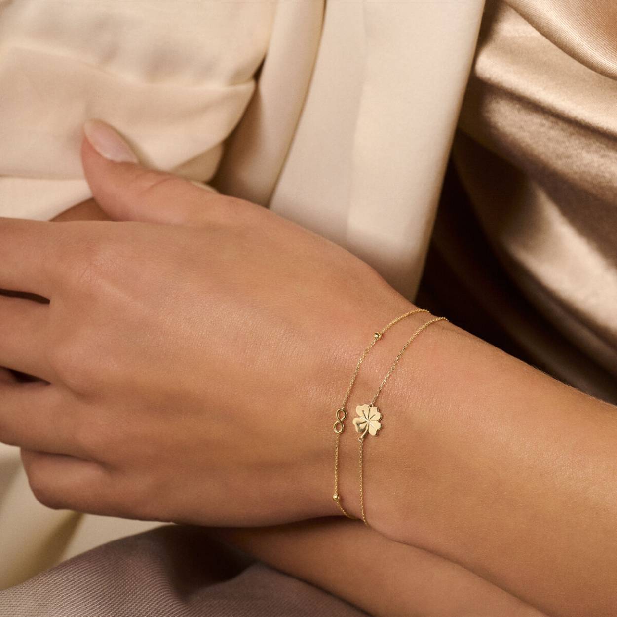 14k Geelgouden armband met een klavertje. De armband heeft draaglengtes van 16.5,17.5 en 18.5cm. De schakelbreedte is 0.8mm.