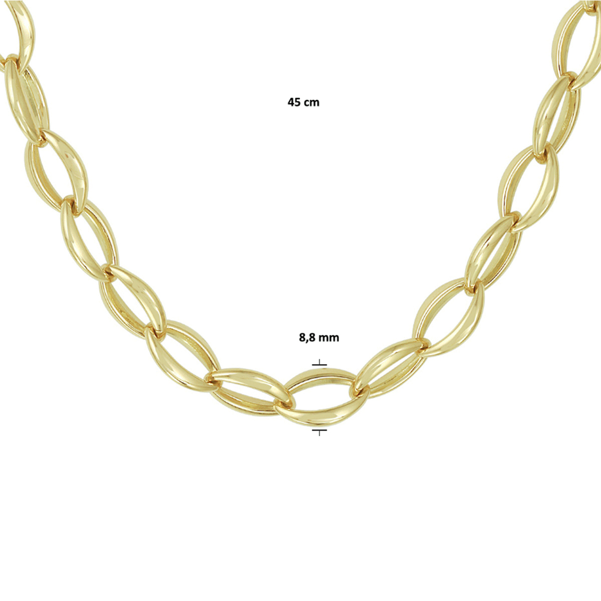 Geelgouden anker collier met een draaglengte van 45cm en een schakelbreedte van 8.8mm. Het collier heeft een poli afwerking en is uitgevoerd met een stevige karabijn sluiting.