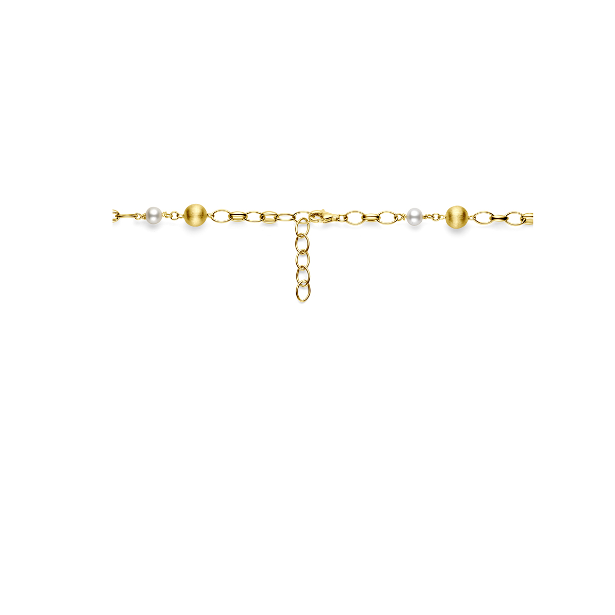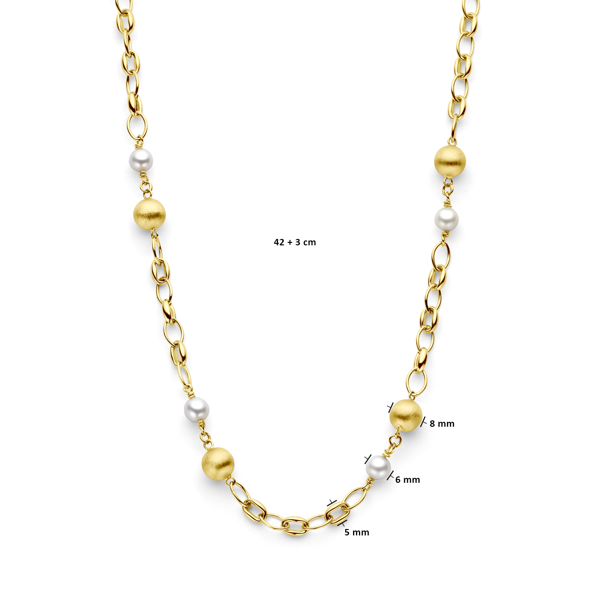 14k Geelgouden collier uitgevoerd met bolletjes en zoetwaterparels. Het collier heeft een schakelbreedte van 5mm en draaglengte van 42cm met 3cm extensie. Uitgevoerd met een karabijn sluiting.
