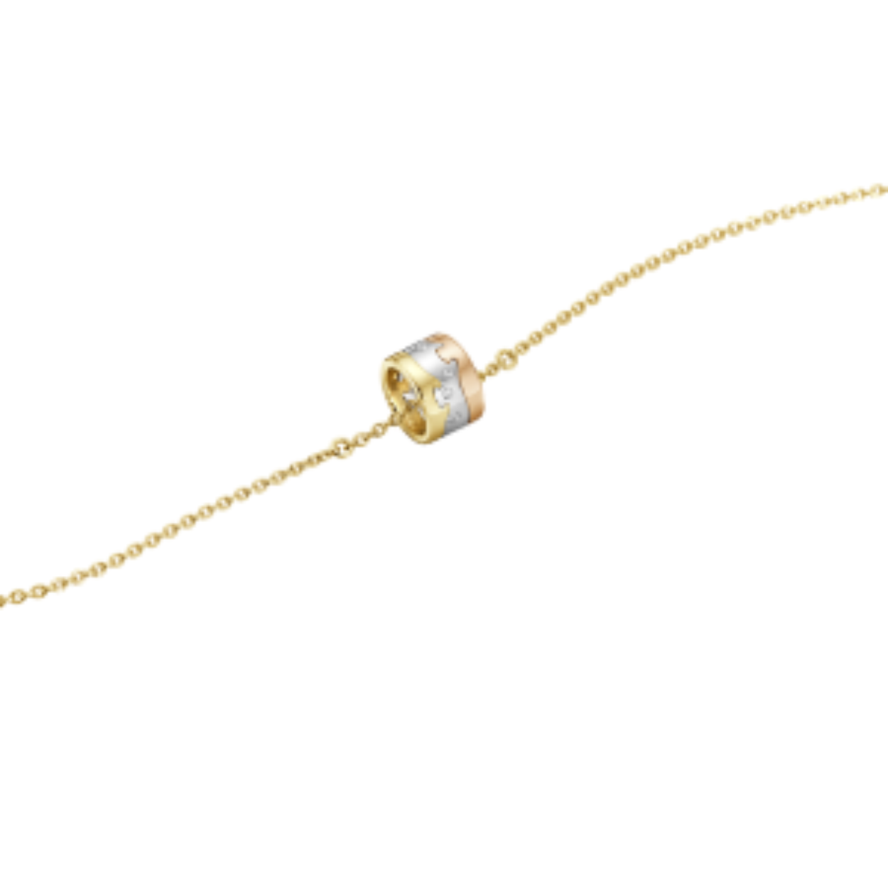 This light and adjustable bracelet, crafted in 18-karat yellow, white and rose gold, includes a miniature Fusion charm with flush-set brilliant cut diamonds individually set by hand.