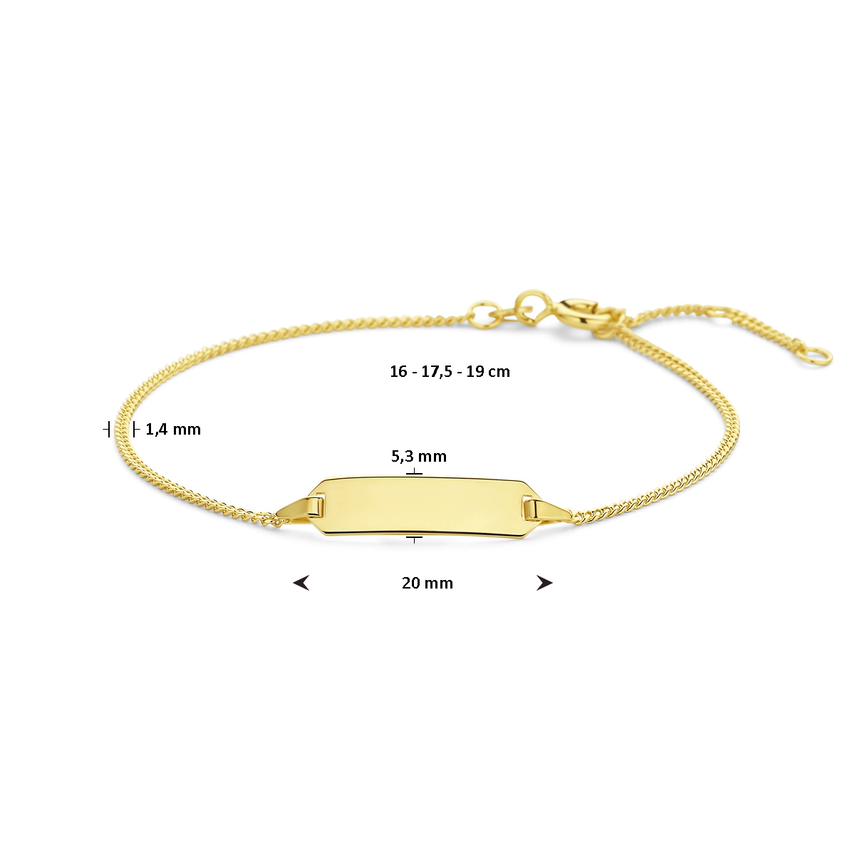 14k Geelgouden graveerarmband met een schakelbreedte van 1.4mm. De plaat heeft een dikte van 0.6mm.