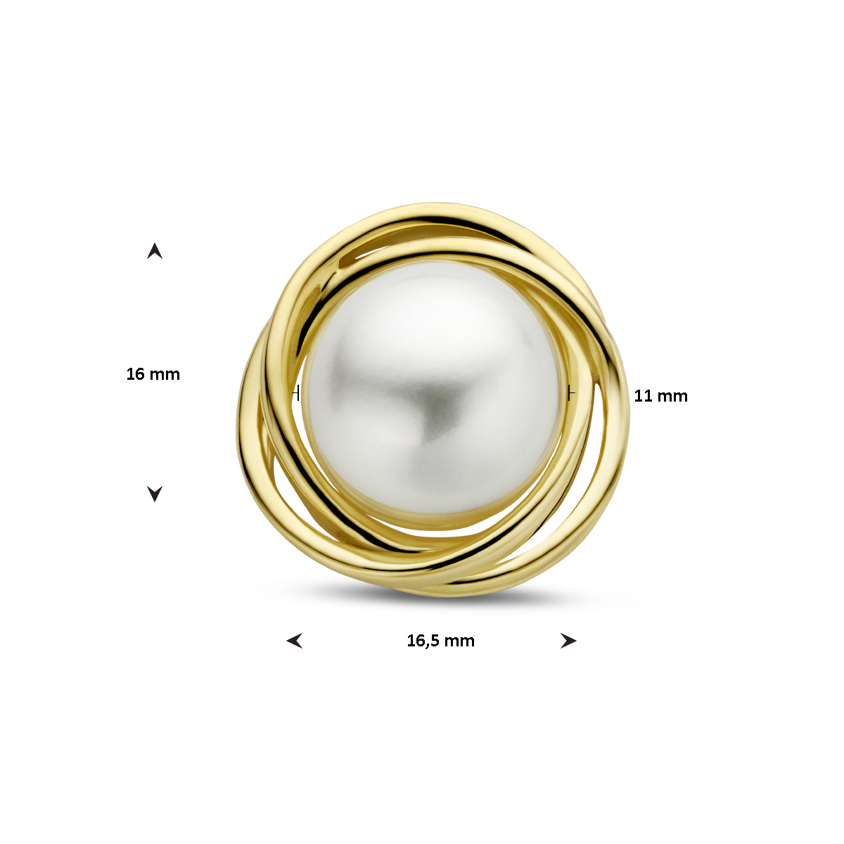 14k Geelgouden hanger uitgevoerd met een zoetwaterparel. De hanger heeft een afmeting van 16x16.5mm.