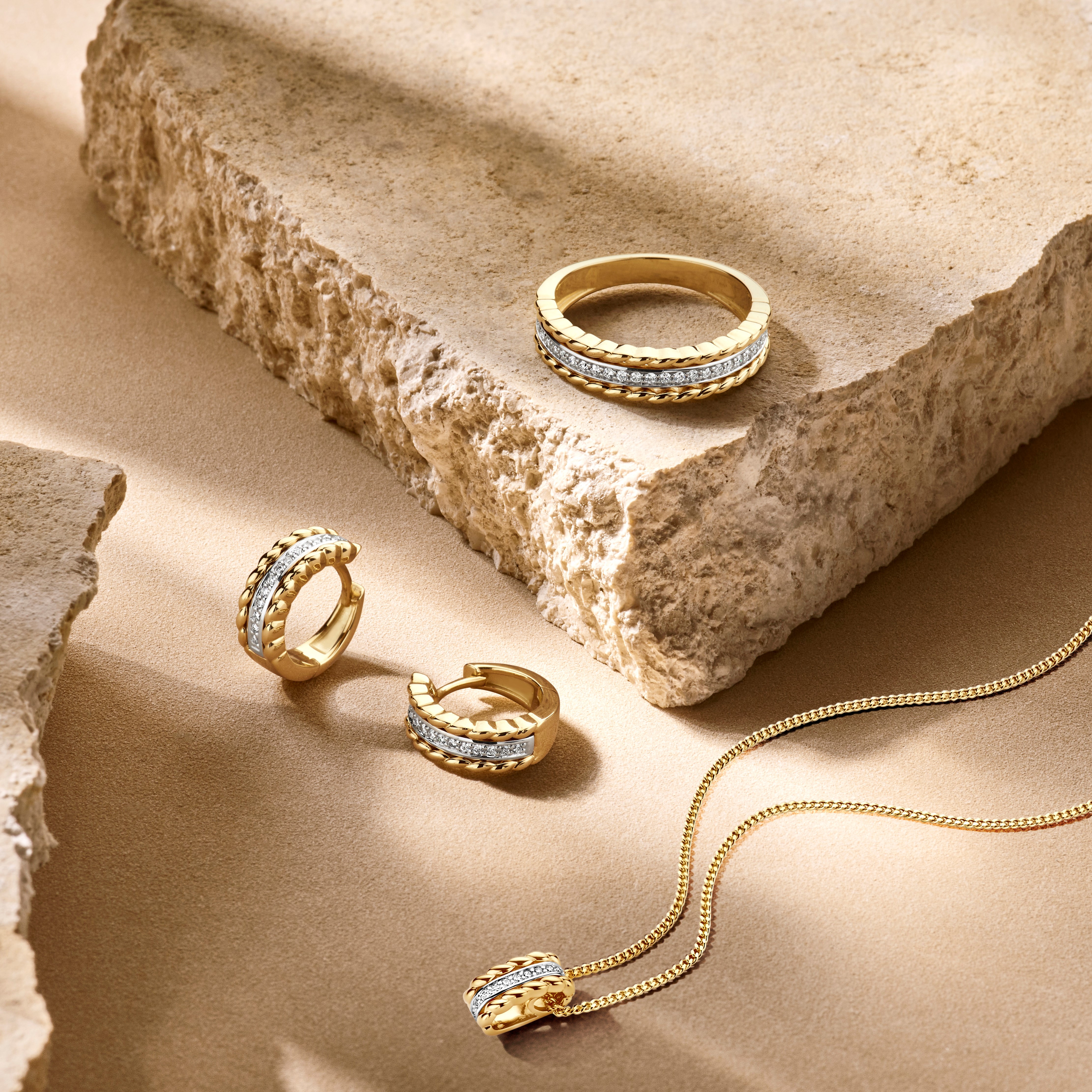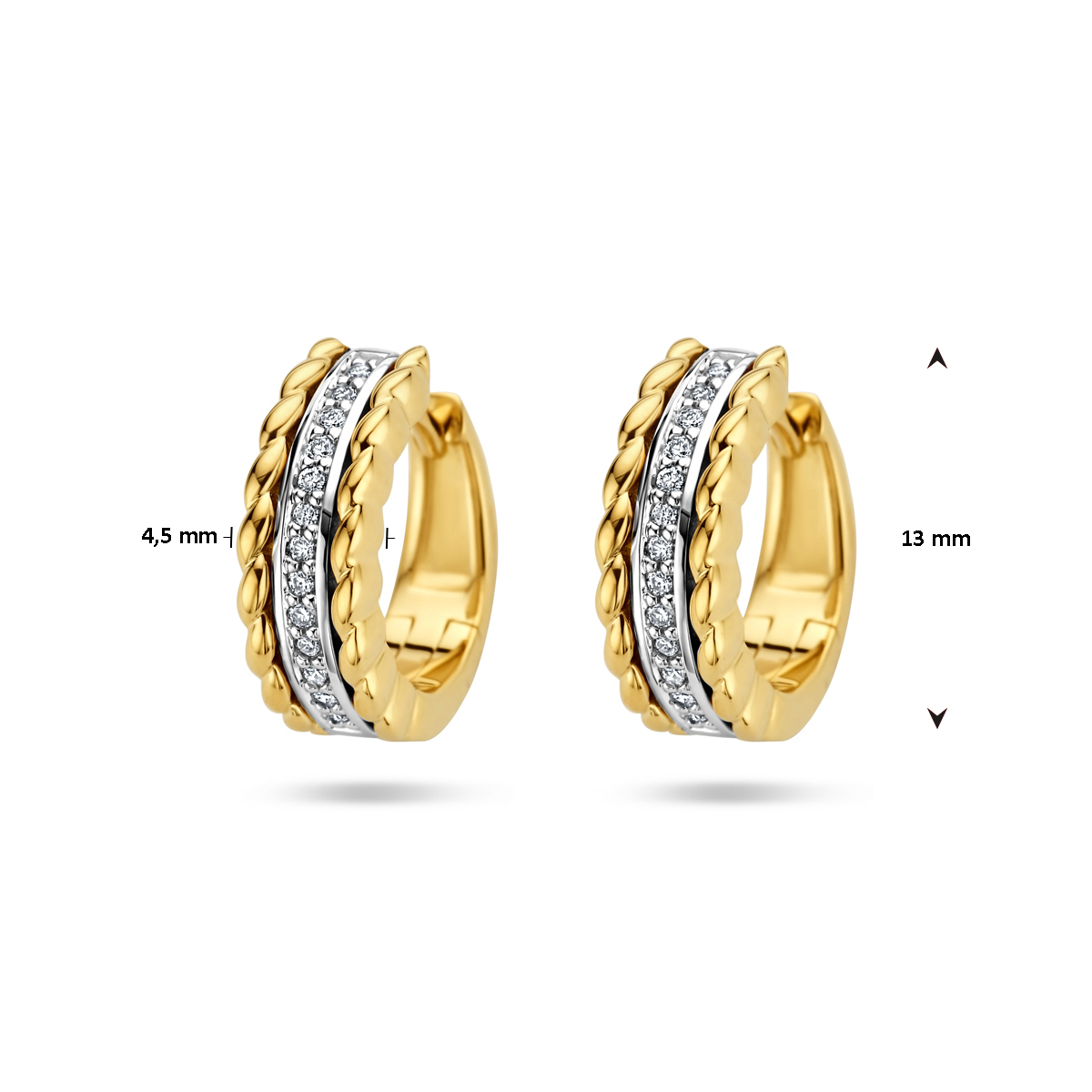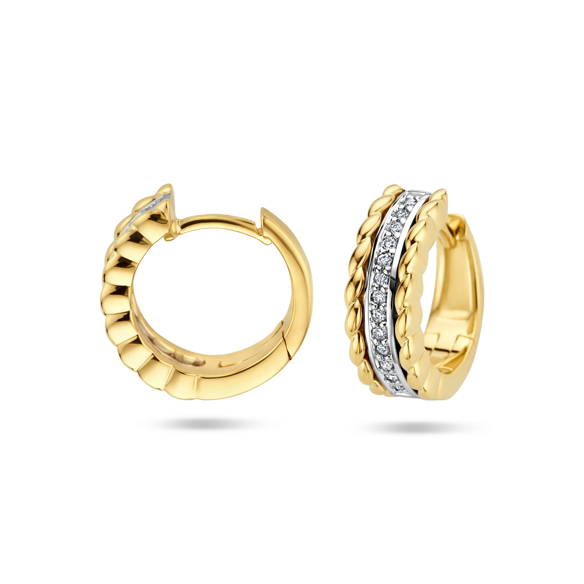 14k Bicolor geel- en witgouden klapoorringen met een diameter van 13mm. Uitgevoerd met een schitterende diamant rij.