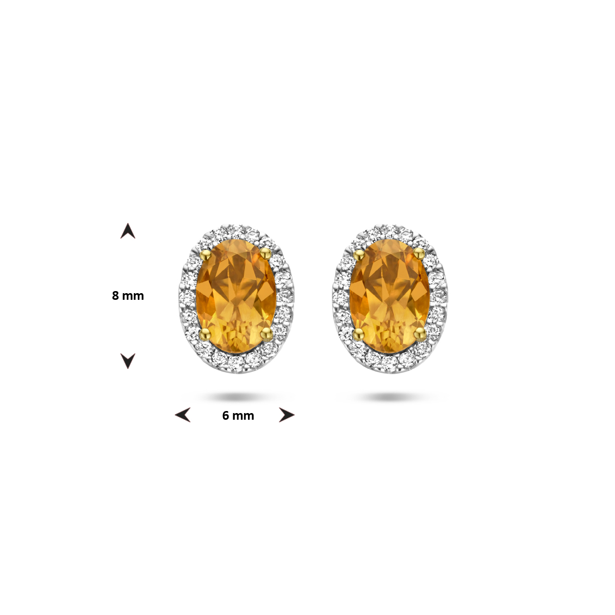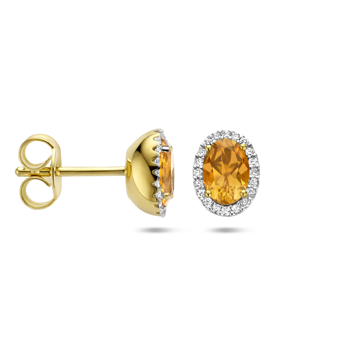 14k Geelgouden oorknoppen uitgevoerd met citrien en schitterende diamant. De oorknoppen hebben een afmeting van 8x6mm en zijn te combineren met bijpassende sieraden uit onze collectie.