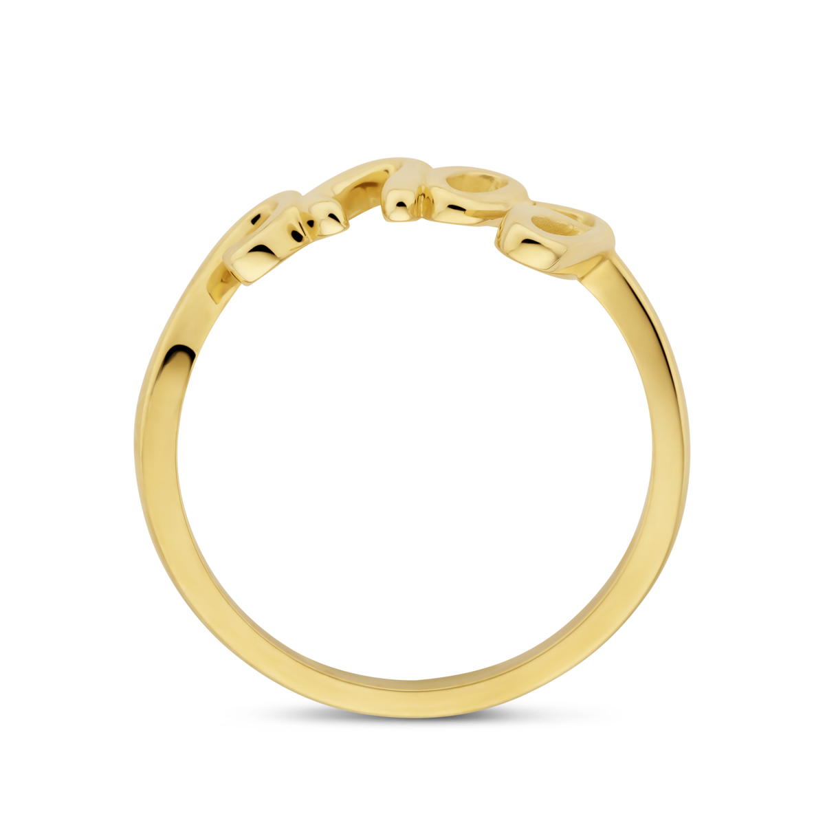 14k Geelgouden ring uitgevoerd met de tekst love. De ring heeft een breedte van 7.5mm.