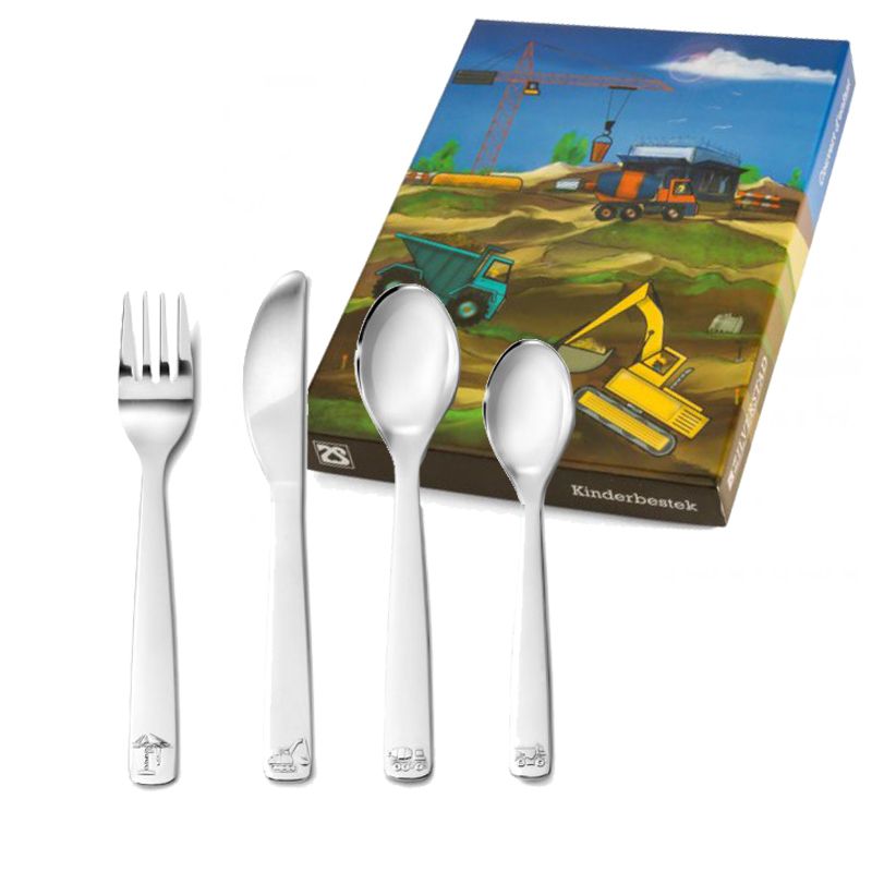 kinder bestek 4 delig bouwvoertuigen, rvs