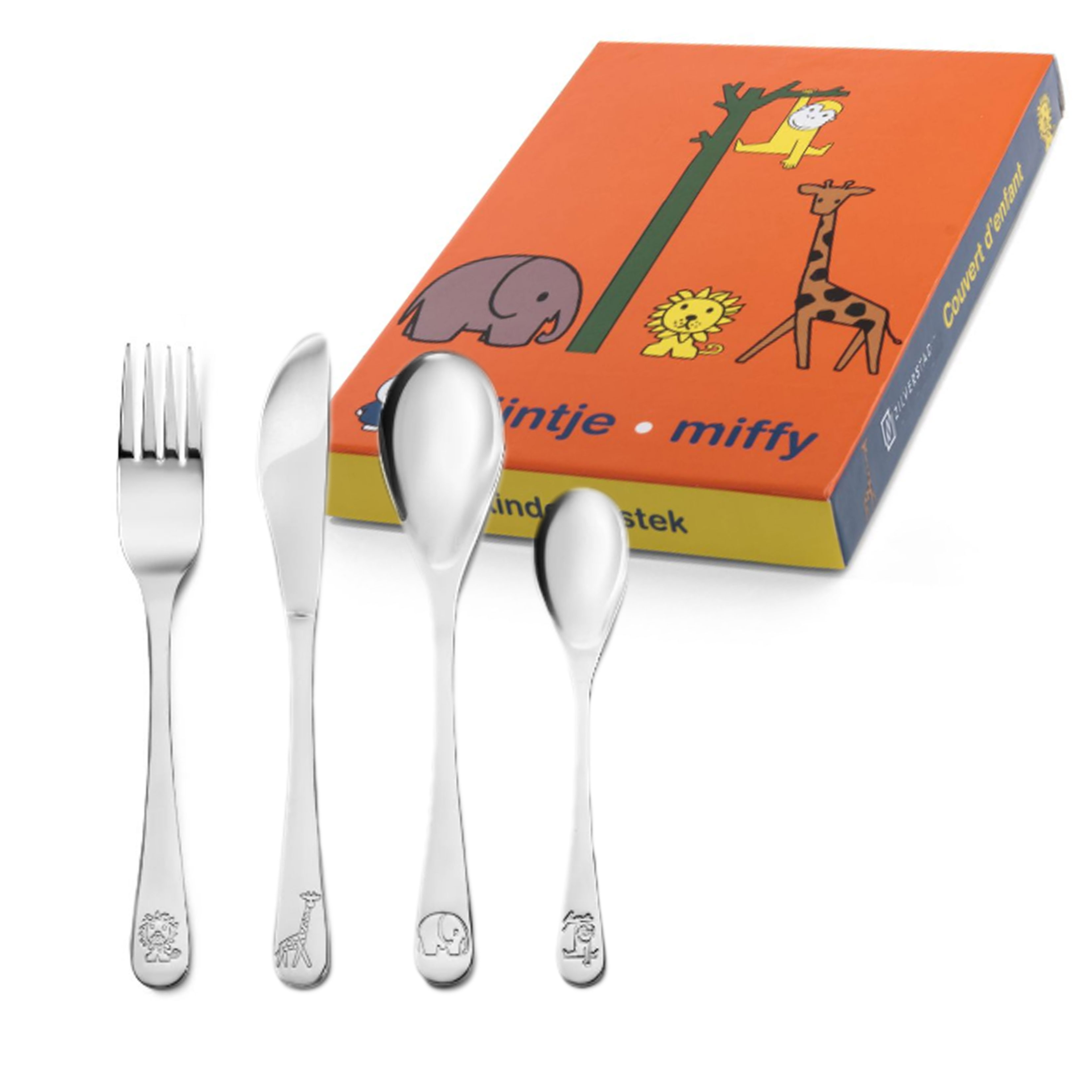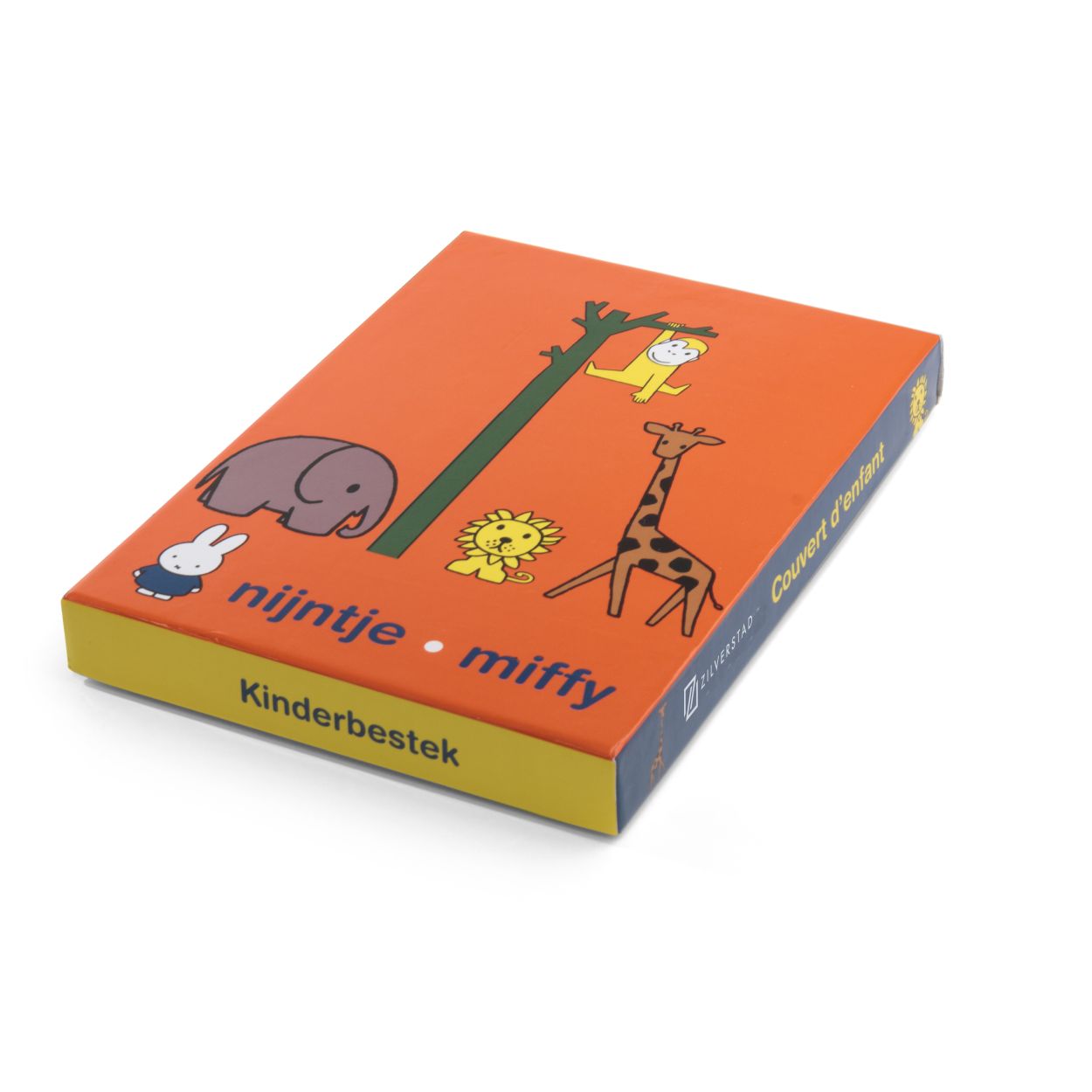Zilverstad Nijntje kinderbestek, rvs 4-delig, met mooie geschenkendoos. Deze 4 delige set bestaande uit een mes, lepel, vork, en dessertlepel is geschikt voor kinderen vanaf 3 jaar.